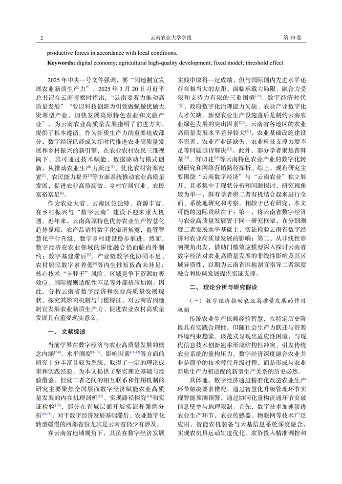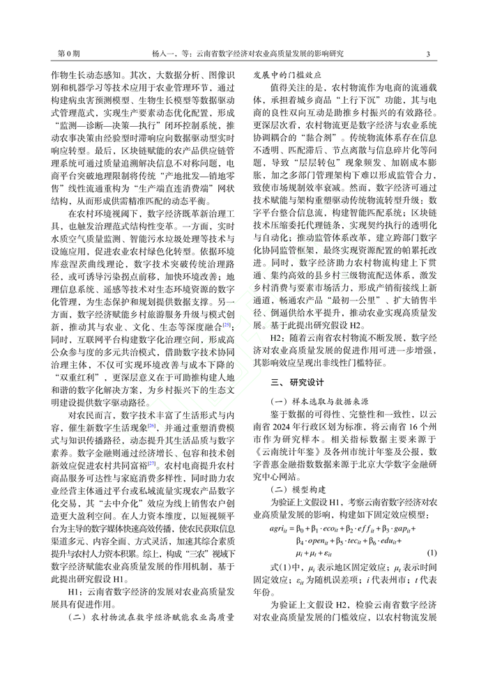 杨入一、谭政、张体伟:云南省数字经济对农业高质量发展的影响研究 —— 基于农村物流的门槛效应