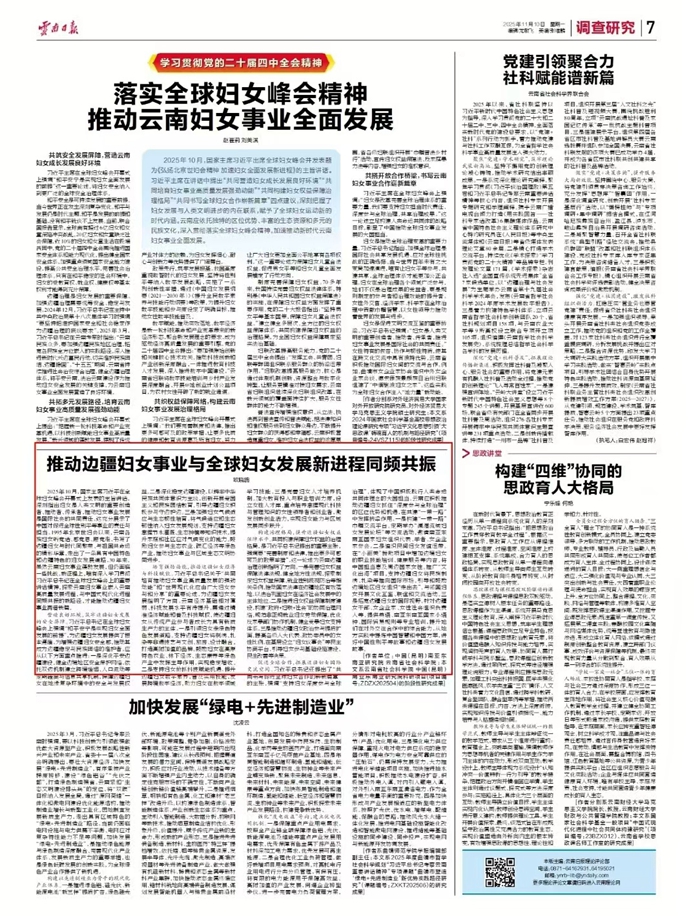 2025年10月,国家主席习近平在全球妇女峰会开幕式上发表的主旨讲话,深刻指出妇女是人类文明的重要创造者、推动者、传承者,推动妇女事业发展是国际社会的共同责任。这充分展示了中国对促进全球性别平等事业的责任与担当。1995年北京世妇会以来,云南各族妇女听党话、感党恩、跟党走,书写了边疆妇女与时代同繁荣、与祖国共命运的精彩华章,走出了一条具有中国特色和边疆特色的妇女发展道路。30年来,虽然云南妇女事业蓬勃发展,但仍面临一些挑战。新征程上,唯有深入学习贯彻习近平总书记在全球妇女峰会上的重要讲话精神,探索云南妇女事业嵌入云南高质量发展进程,与中国式现代化进程同频共振的新路径,才能推动边疆妇女事业再谱新篇。