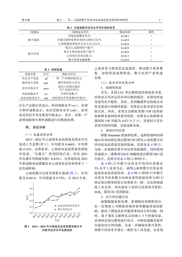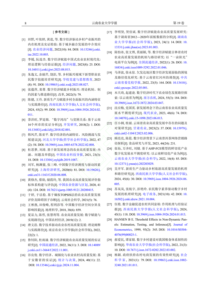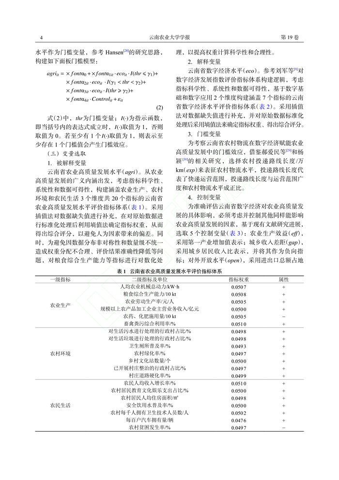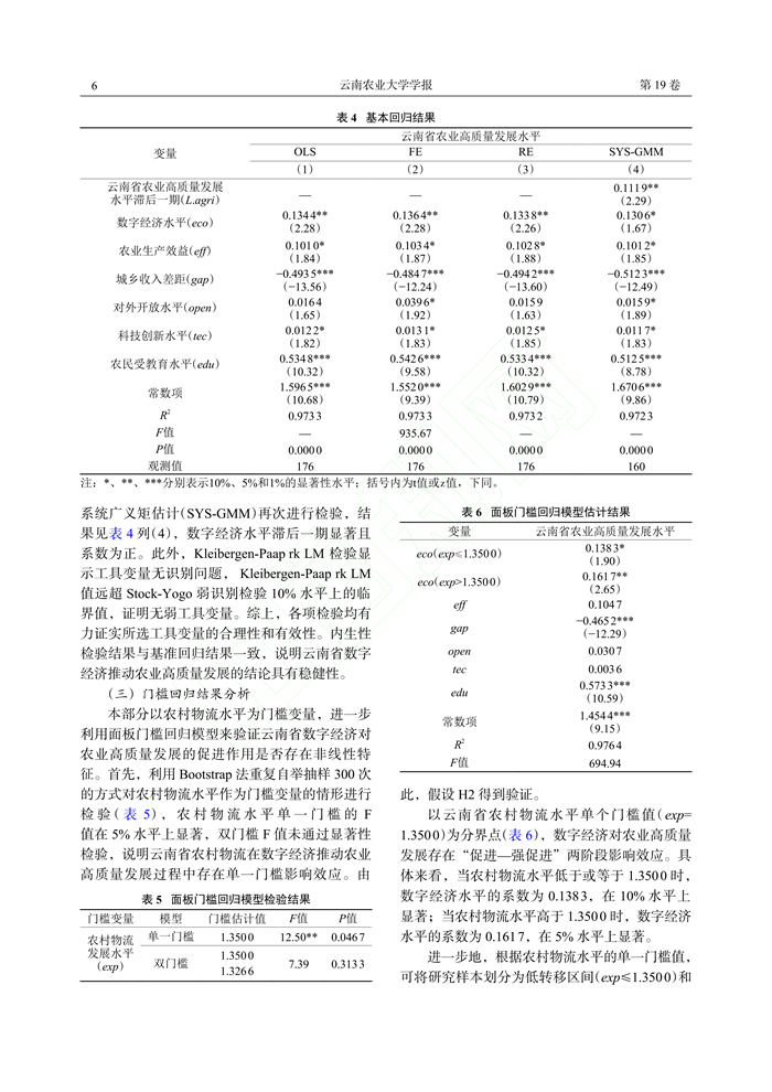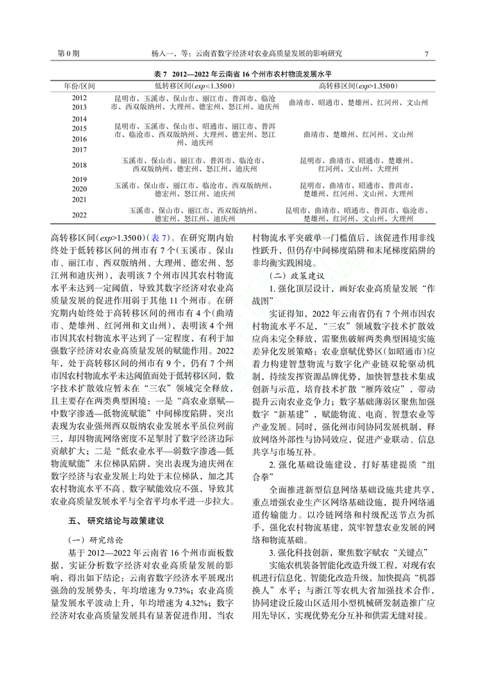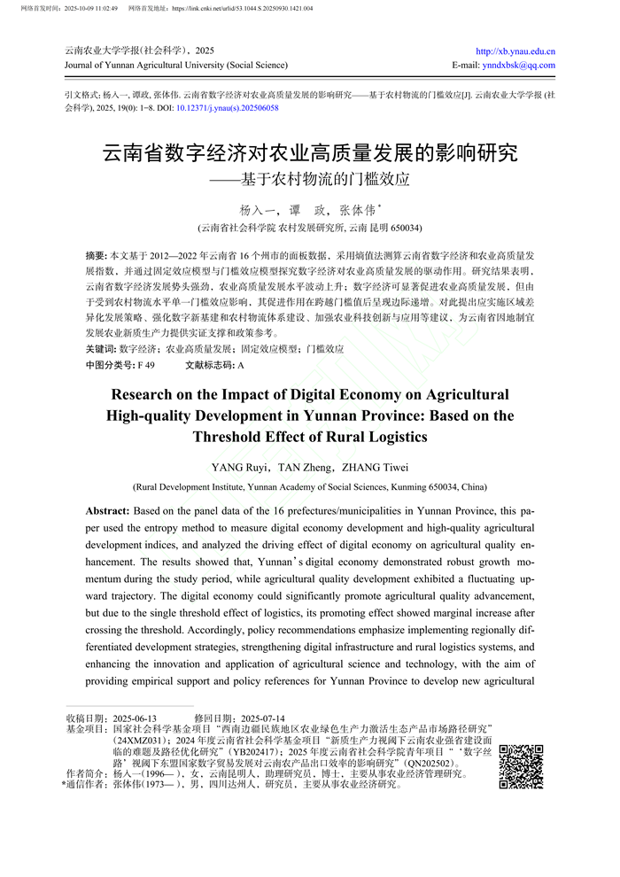 杨入一、谭政、张体伟:云南省数字经济对农业高质量发展的影响研究 —— 基于农村物流的门槛效应